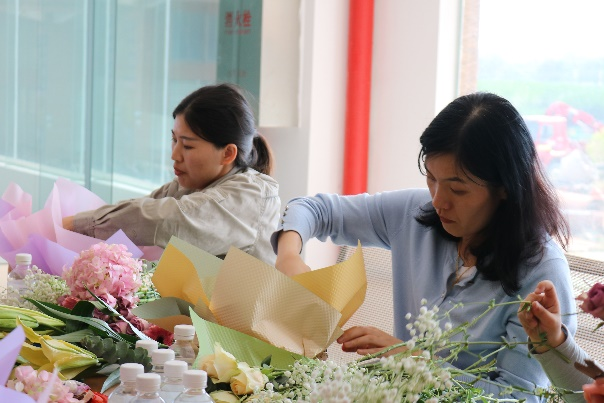在由玫瑰花、洋桔梗、繡球花、百合、滿天星之香氣調(diào)和而成的陣陣馨香中,花藝師向女職工們講解插花知識,介紹花材的名稱、養(yǎng)護方案、花材的處理和修剪方法,示范插花步驟,女職工們聚精會神地學習后認真設計自己的花籃,相互討論,時不時迸發(fā)出爽朗的笑聲,經(jīng)過精心設計,一個個形態(tài)飽滿、充滿生命力的花籃就誕生了,大家紛紛拿出手機,記錄下這美好的時刻。