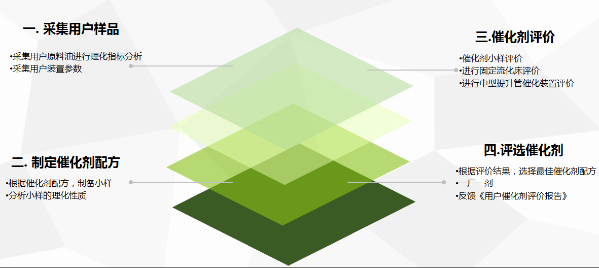 銷售人員負責售前采集客戶生產工藝數據、原料油樣品等,然后交由技術服務中心分析,研發部根據分析結果制備催化劑小樣,通過重油微反實驗裝置、固定流化床實驗裝置和中型提升管催化裂化裝置,對催化劑配方篩選和工藝效果實施三級評價,根據評價結果靈活調整催化劑配方重復試驗并選定最優方案交由生產管理部實施定制化生產。